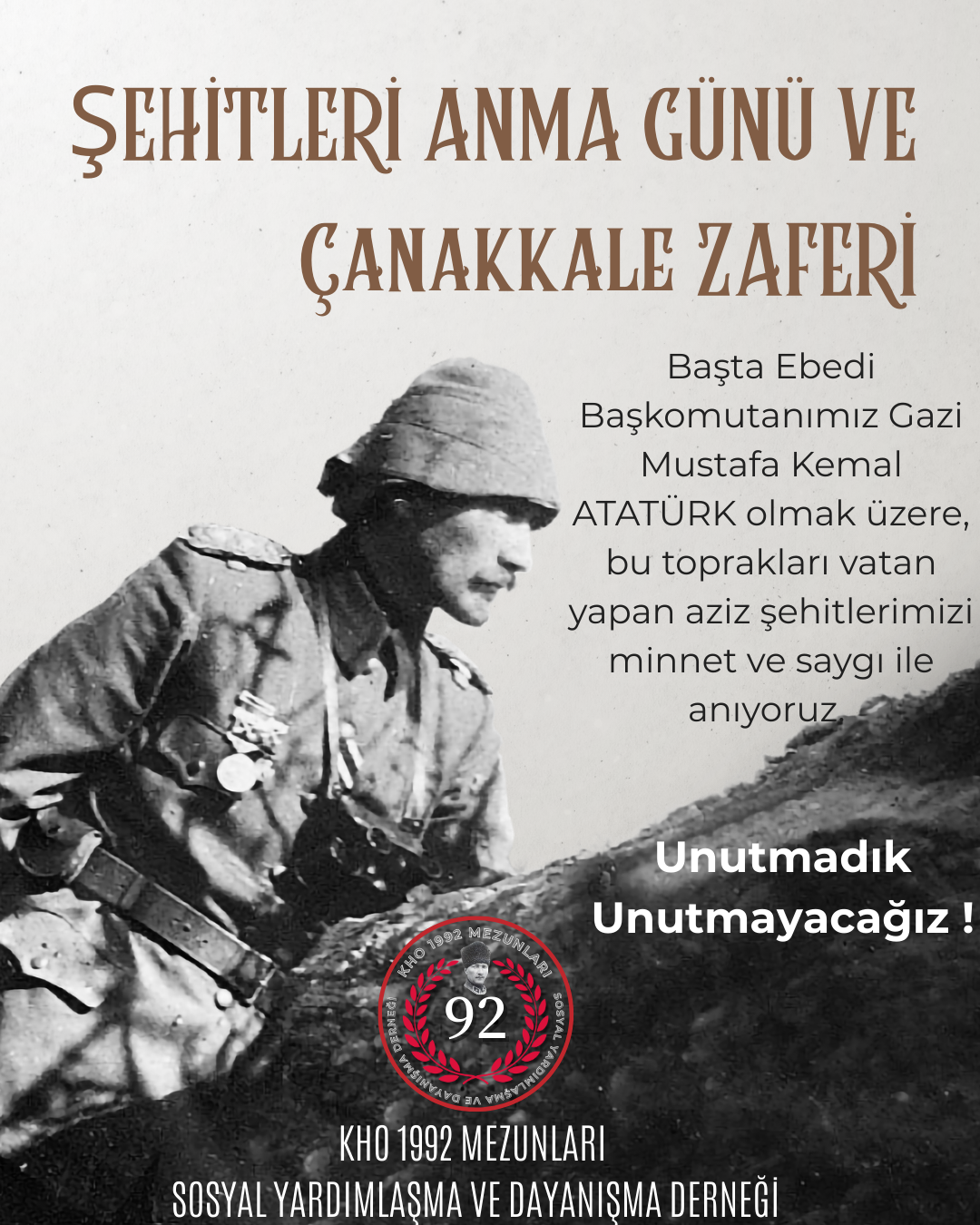 Başta Ebedi Başkomutanımız Gazi Mustafa Kemal ATATÜRK olmak üzere, bu toprakları vatan yapan aziz şehitlerimizi minnet ve saygı ile anıyoruz. Aziz ve asil ruhları şad olsun. Unutmadık, unutmayacağız !