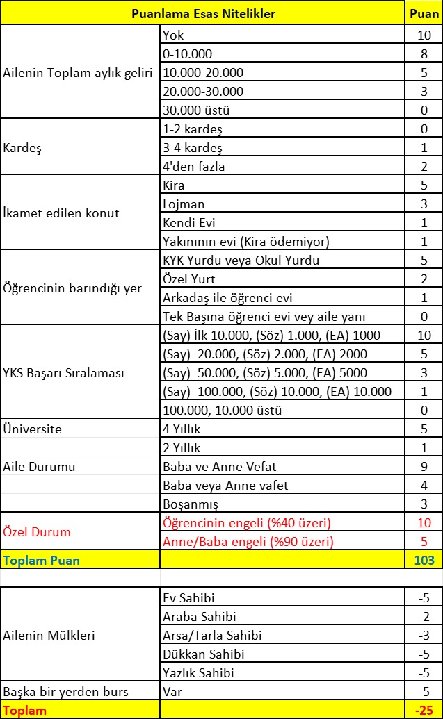 Burs Değerlendirme Kriterleri aşağıda sunulmuştur :